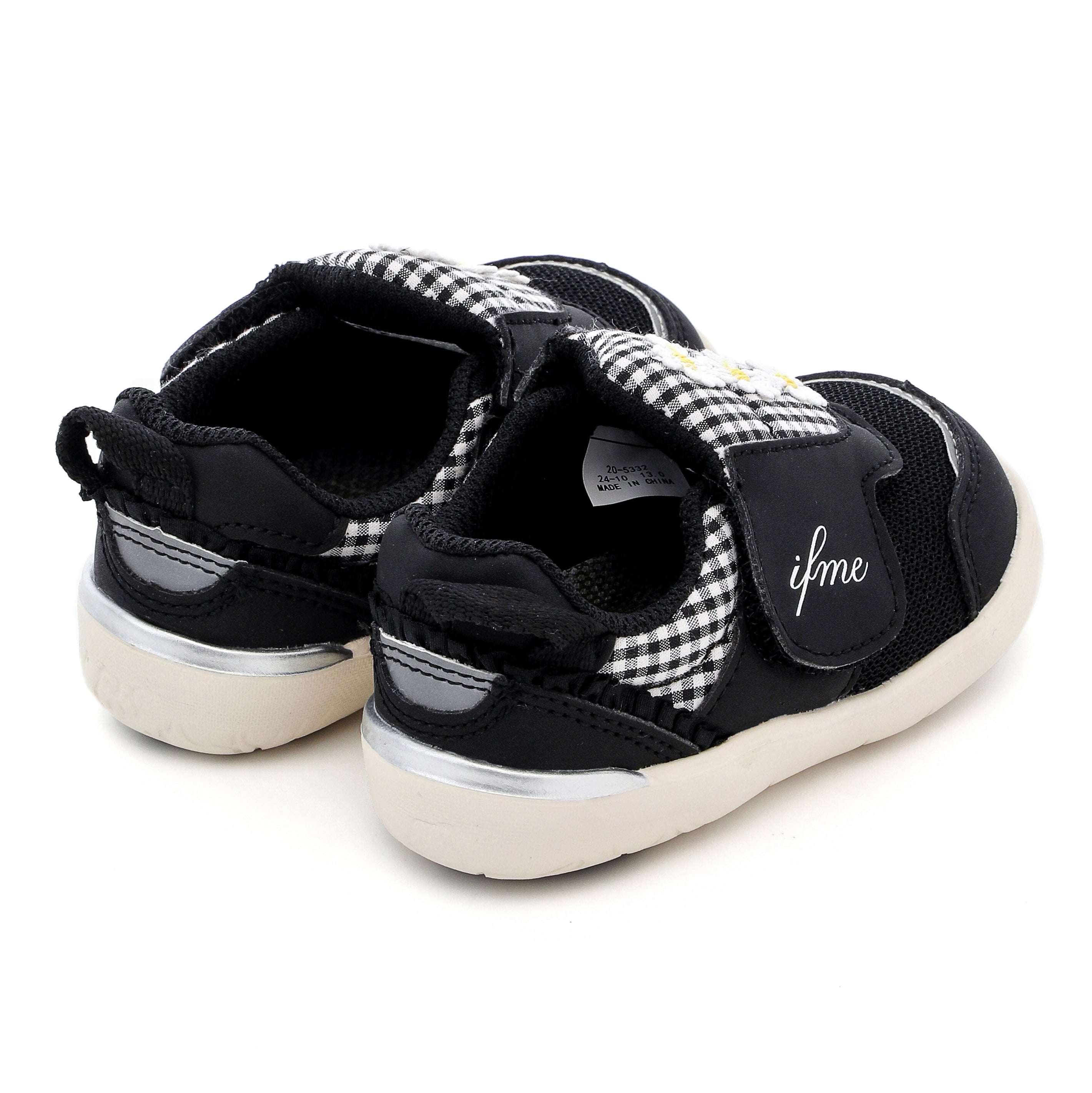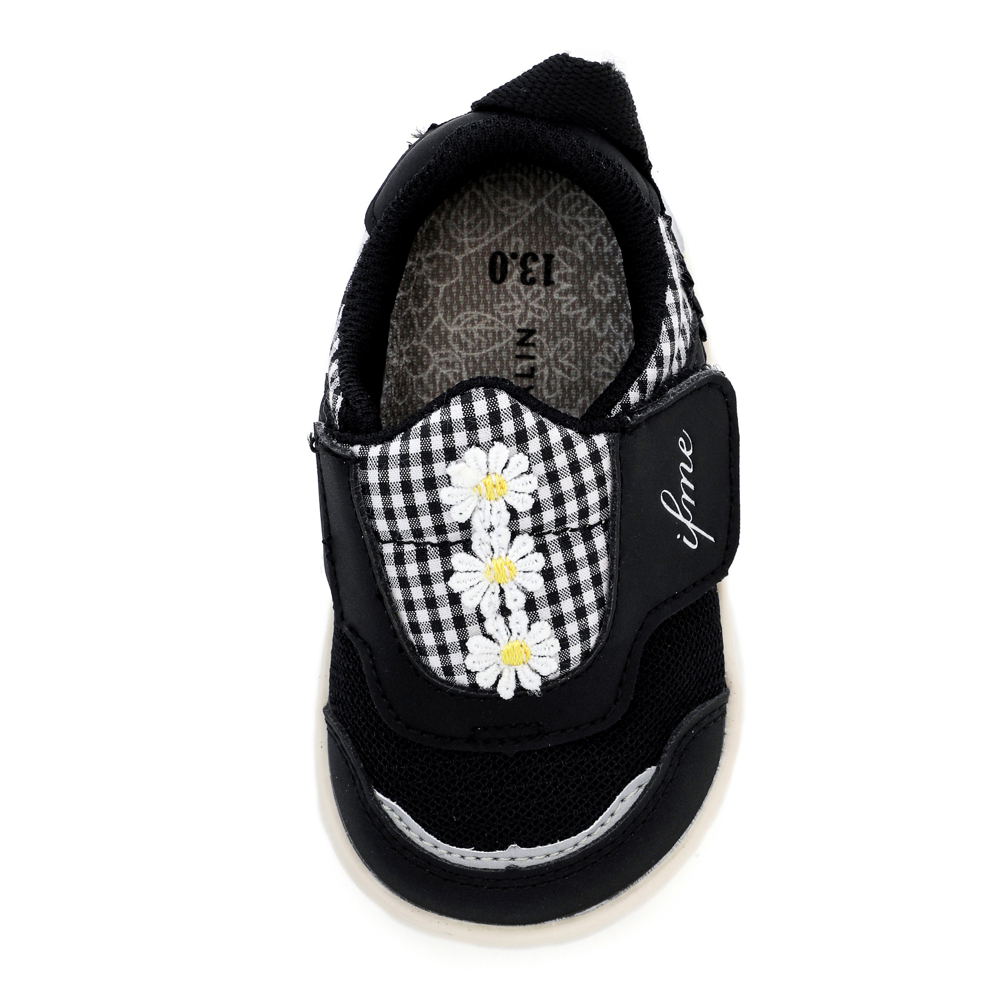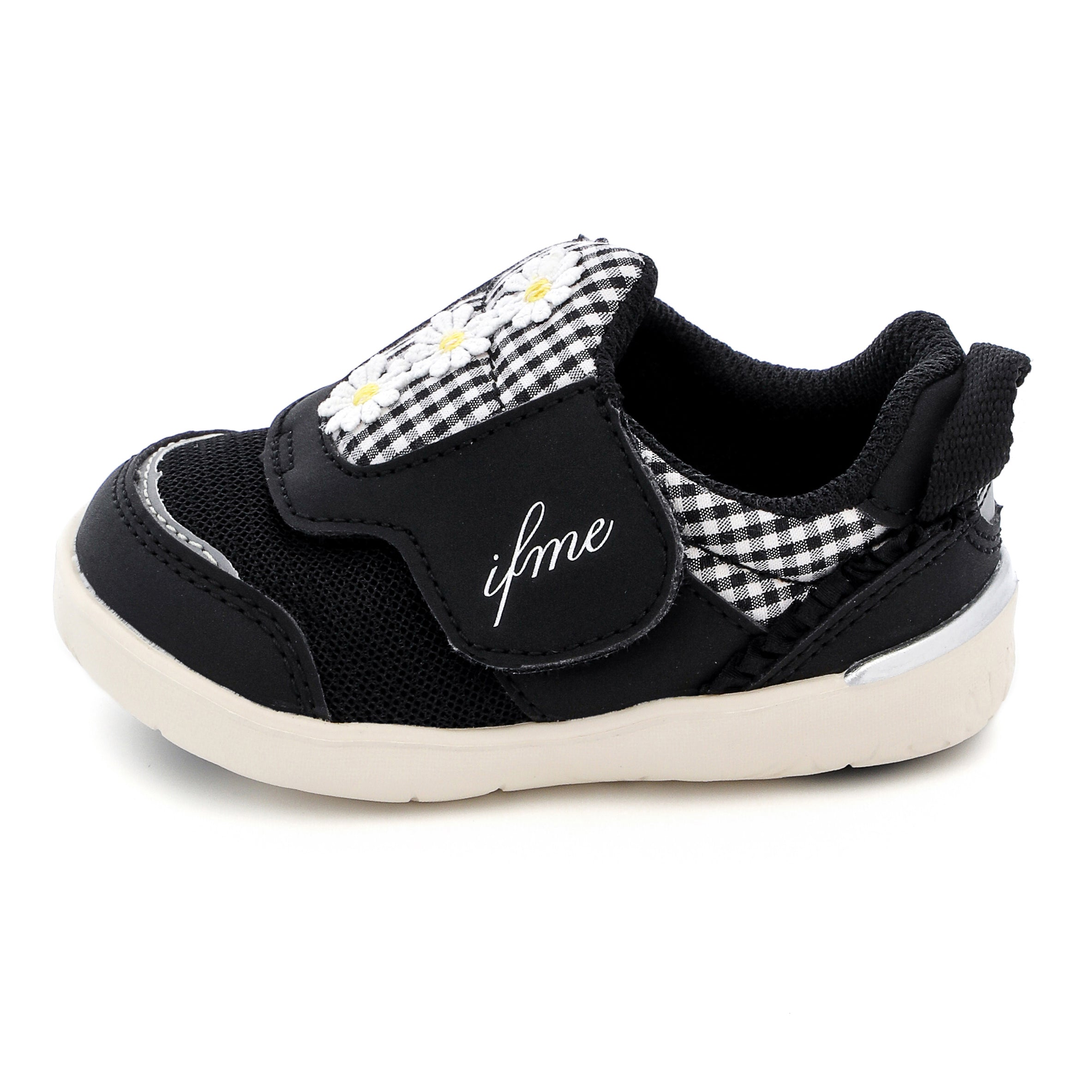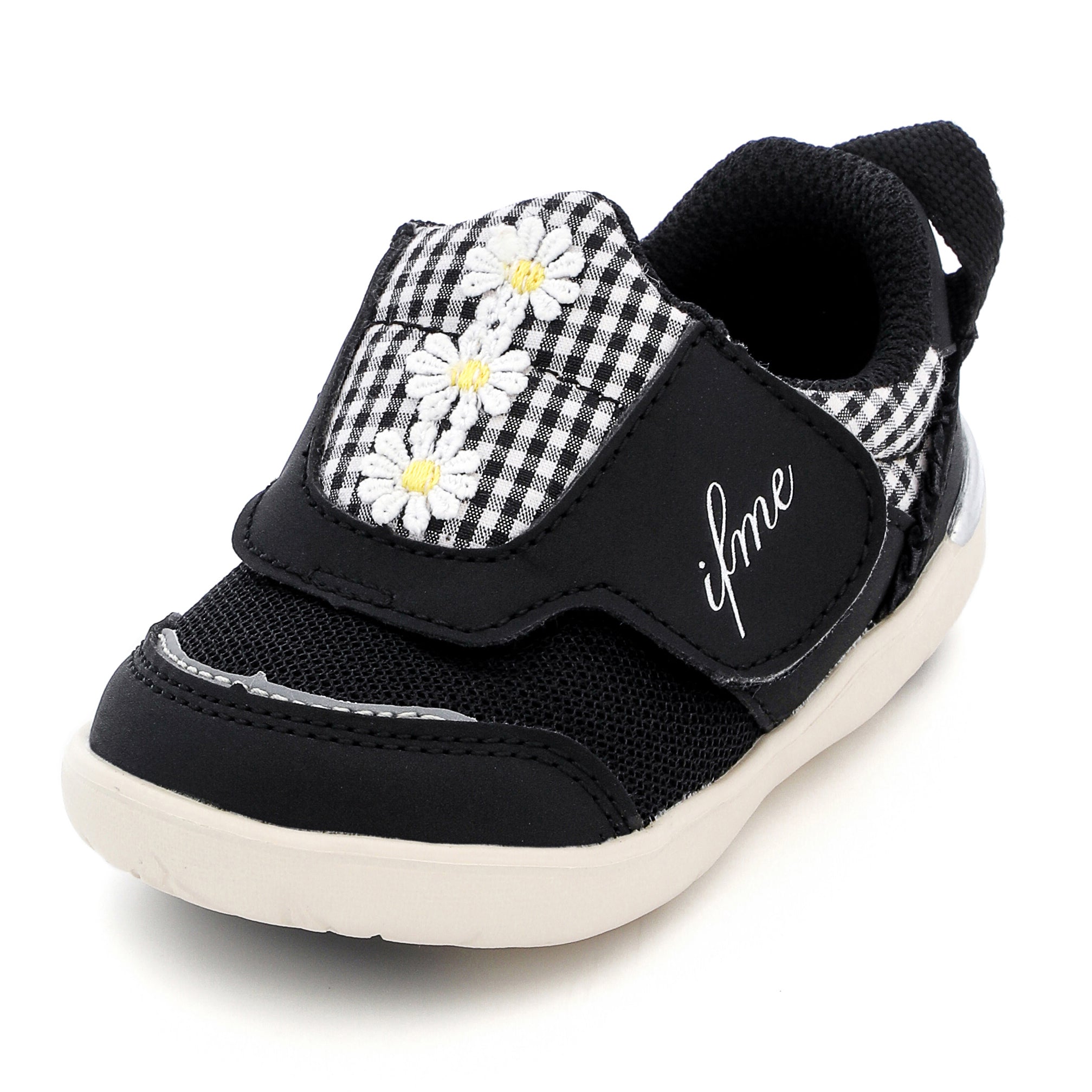 脱ぎ履き簡単なpattoスニーカー。ちょこんと並んだデイジーモチーフが魅力のシューズです。さりげなくあしらったチェック生地にもこだわり、キュートな一足に仕上げました。お揃いでキッズサイズもあります。