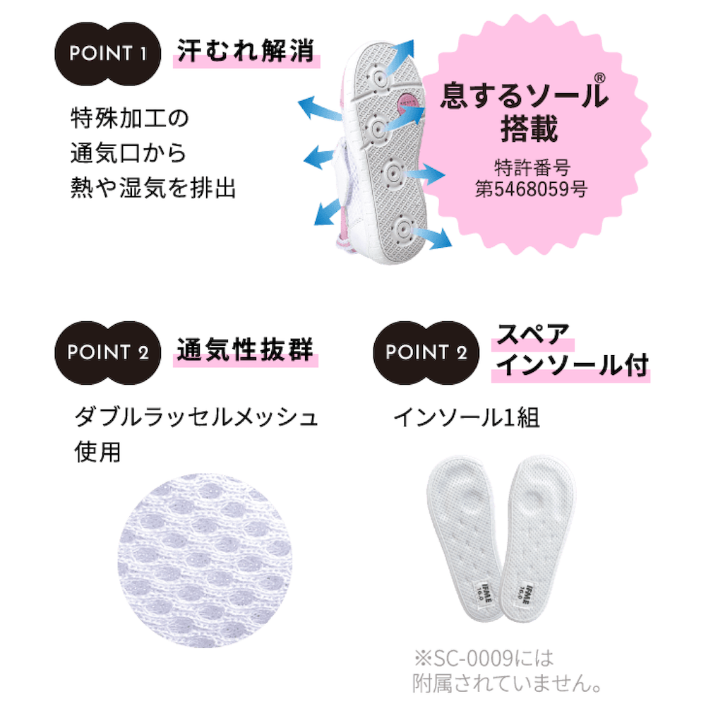 IFMEのロングセラー商品の上履きバレエシューズタイプ。ムレを防ぐ「息するソール」、通気性のよいダブルラッセルのメッシュ使い、スペアインソール付きなど、子供が長時間履くことを想定して作られた上履きは、快適に過ごせる為のポイントが満載です。